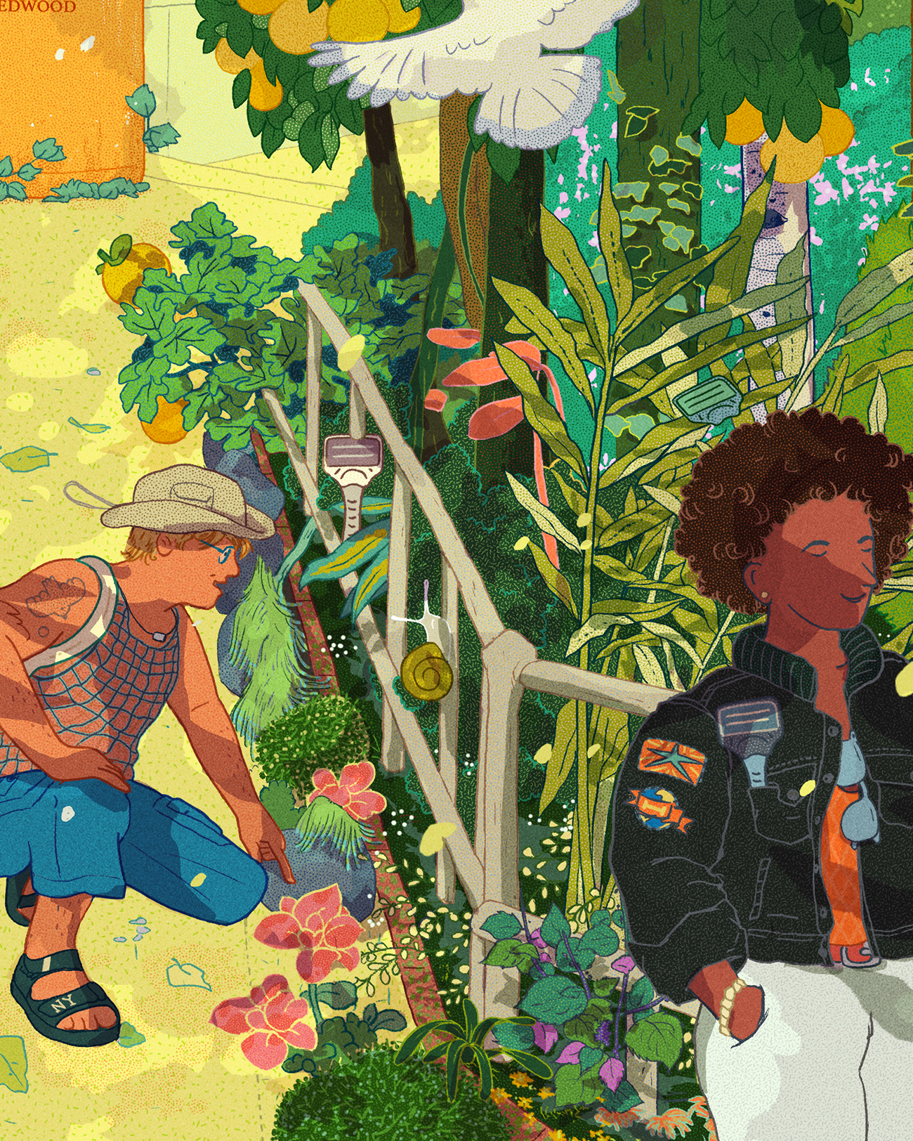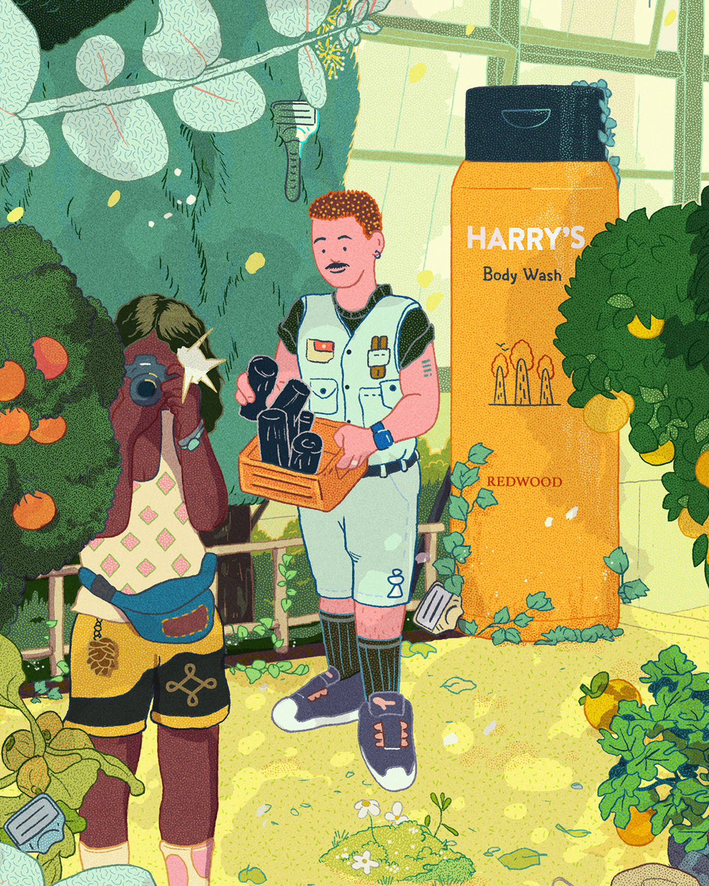 For the Harry’s Botanical Garden, I illustrated a lush tapestry where razor blades emerge among ferns and petals—each leaf and flower carefully hand‑drawn to echo grooming tools in disguise. The result is a peaceful, immersive scene that surprises users with discovery, marrying nature’s calm with product purpose in a single sweeping visual.